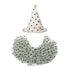 The pointed hat with polka dots and pompoms perfectly complements the crinkled shawl, creating the ultimate clown outfit!