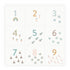 One side features numbers and small elements that encourage learning to count and recognizing numbers, while the other side has a lovely and simple dotted pattern.